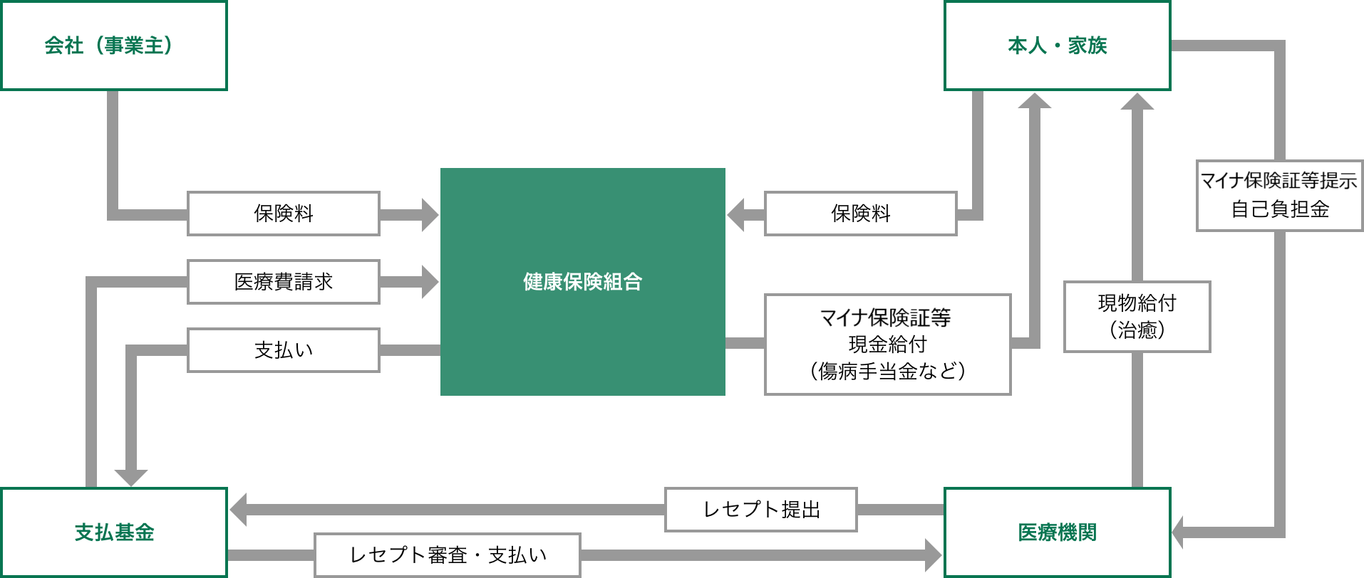 病気やけがをしたとき、私たちは医療機関の窓口へマイナ保険証等〔健康保険証・資格確認書を含む〕を提示して、医療費の一部を自己負担します。残りの医療費については、医療機関が社会保険診療報酬支払基金(支払基金)という機関を経て、健保組合に請求します。健保組合では、その請求書(診療報酬請求明細書=レセプト)に間違いがないかを確認したうえで、再び支払機関を通じて、医療機関に支払います。